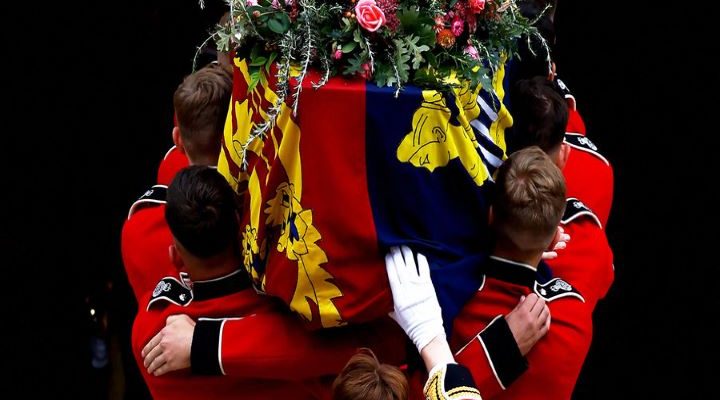 Revenant sur la cérémonie, RFI rapporte qu’« En milieu de matinée, au son des cornemuses, le cercueil de la souveraine, surmonté de la scintillante couronne impériale, a quitté Westminster Hall, la partie la plus ancienne du Parlement, pour rejoindre l’abbaye de Westminster voisine ». « Des dizaines de marins le tiraient, suivis du roi Charles III, ses frères et sœur et ses enfants, les frères William, l’héritier, et Harry » poursuit la radio française.