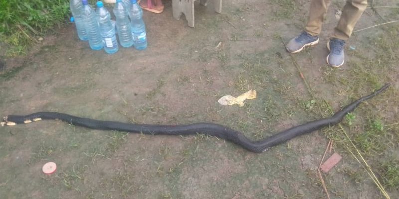 Dans un sursaut de courage, Kevin Moussavou, la trentaine, réussit à frapper des coups de machette sur la colonne du reptile qui perd tout de suite l’équilibre. Mais levant la tête à nouveau, il ne baissera pas la garde, avant que les populations décident ensemble de le tuer, à coup de pierres, de bâtons, de ferraille et autres.