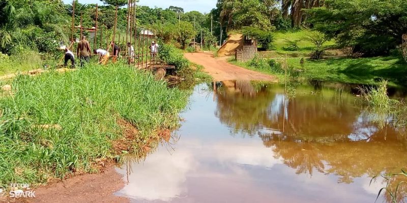 Au constat qu’il pleut en amont de la Ngounié, la passerelle sur le ruisseau Doufoura, vers le lycée confessionnel catholique n’a pas échappé à l’engloutissement des eaux brunâtres. Et le pont en longrines de bois construit en 1963 par la société des fibres du Congo (SOFICO), qui avait cédé il y a près 6 ans sous le poids d’un camion de sable, avait été remplacé par cette passerelle piétonne empruntée par les vélos et motocyclettes. Avec l’usure causée par les intempéries, les planches ont également cédé et la passerelle n’était plus accessible. Tout le monde empruntait la voie de substitution réservée aux véhicules, laquelle est aussi engloutie à plus d’un mètre depuis trois jours. Seuls les véhicules munis d’un 4×4 s’y aventurent.