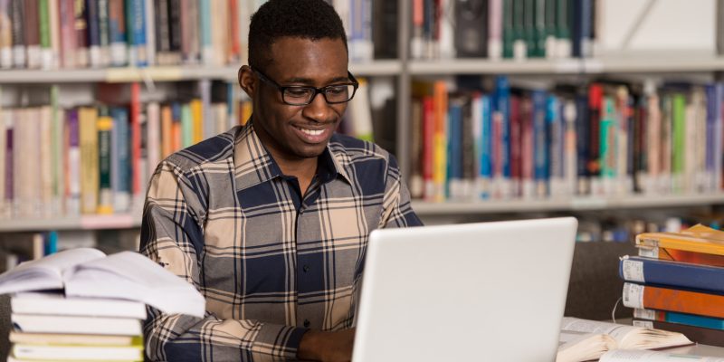 In The Library - Handsome African Male Student With Laptop And Books Working In A High School - University Library - Shallow Depth Of Field